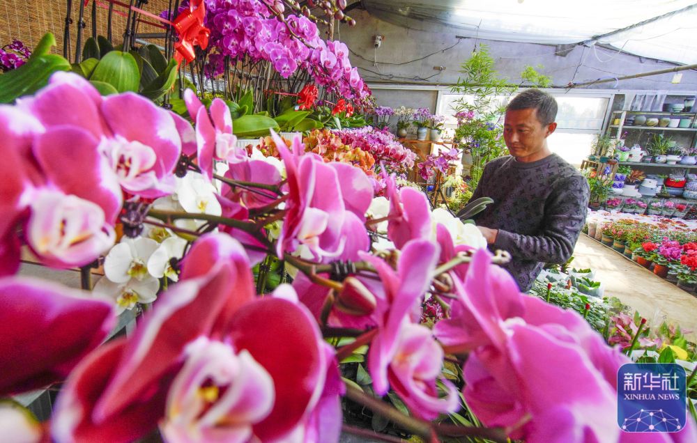 ↑1月22日,河北省遵化市遵化鎮(zhèn)張家坎村農(nóng)民在暖棚管護花卉,準備供應節(jié)日市場。新華社發(fā)(劉滿倉攝)