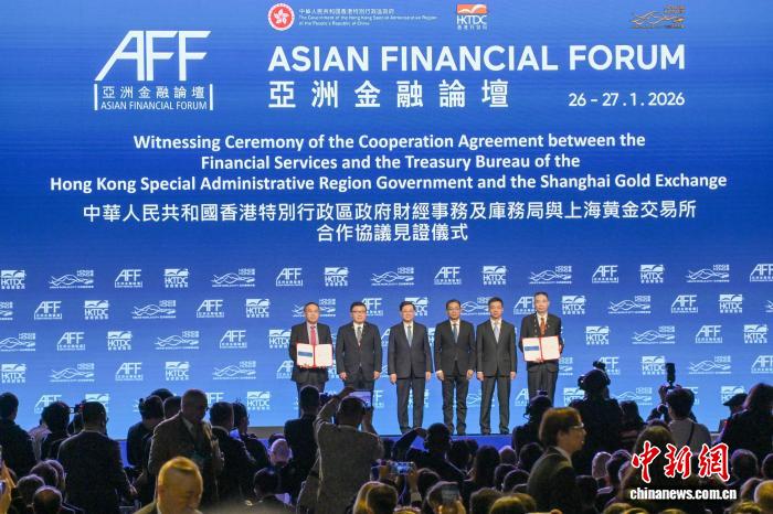 1月26日,在香港揭幕的第19屆亞洲金融論壇上,香港特區(qū)政府財(cái)經(jīng)事務(wù)及庫務(wù)局與上海黃金交易所簽署合作協(xié)議,推動(dòng)兩地黃金市場合作。圖為香港特區(qū)行政長官李家超(左三)、中國人民銀行副行長鄒瀾(右三)等嘉賓見證簽署合作協(xié)議?!≈行律缬浾?陳永諾 攝