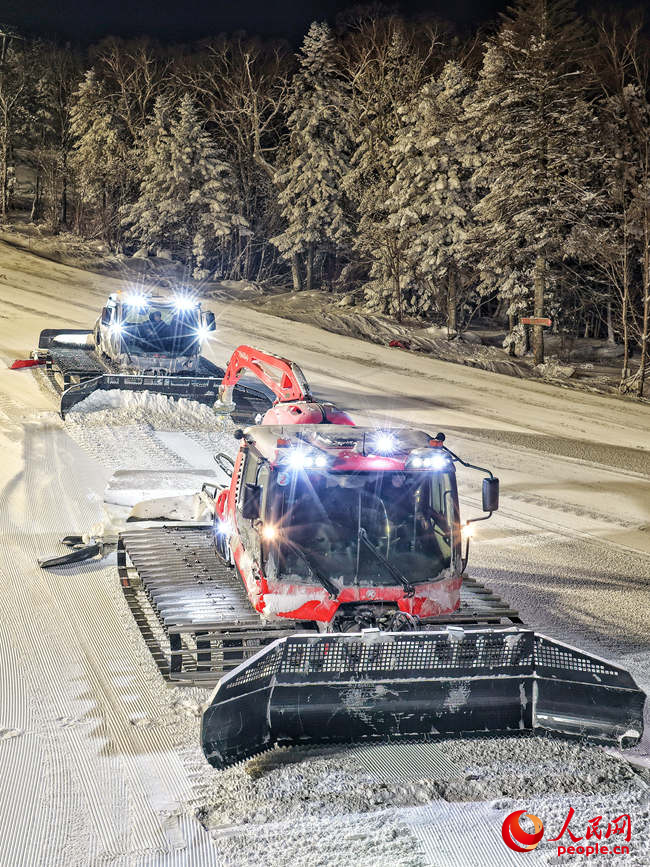 張斌駕駛壓雪機在雪場內(nèi)平整雪道。人民網(wǎng)記者李洋攝