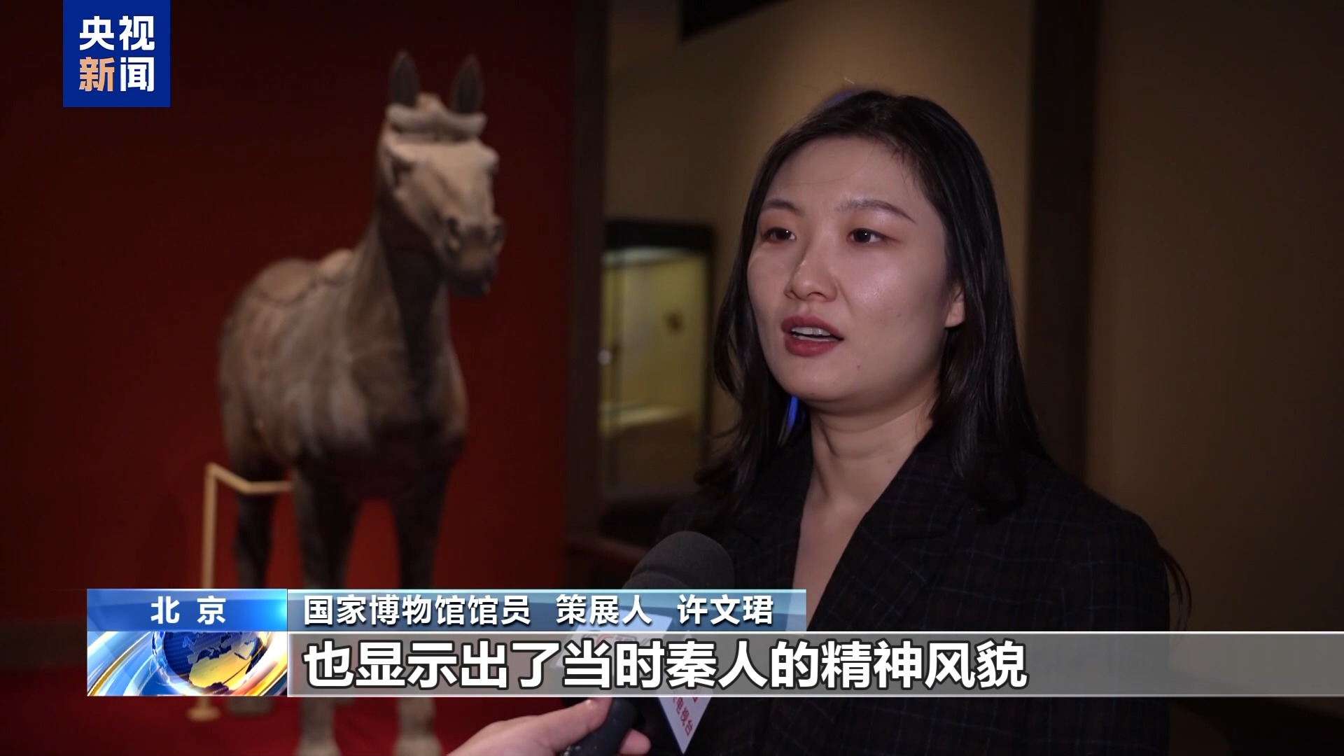 國家博物館館員、策展人 許文珺:這一件秦始皇帝陵兵馬俑的秦鞍馬,雙蹄直立,它的耳朵是直立的,尾巴也是梳成一個辮狀,整體非常有力量,也是秦代人對戰(zhàn)馬篩選標準非常嚴格的體現,也顯示出了當時秦人的一個精神風貌。