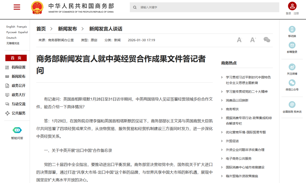 中國網1月30日訊 據商務部網站消息,商務部新聞發(fā)言人就中英經貿合作成果文件答記者問。