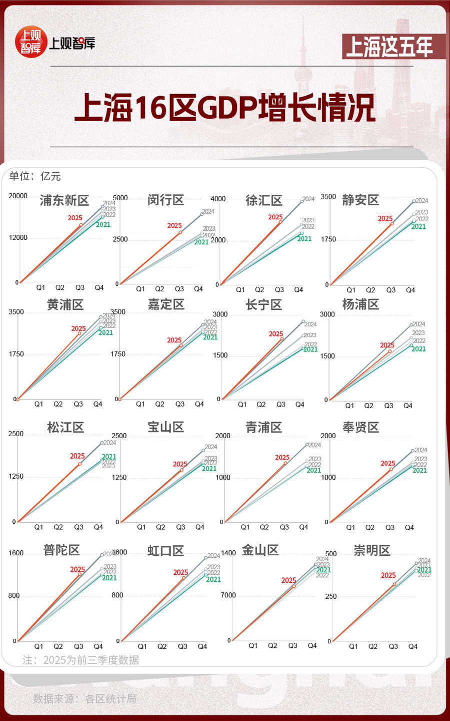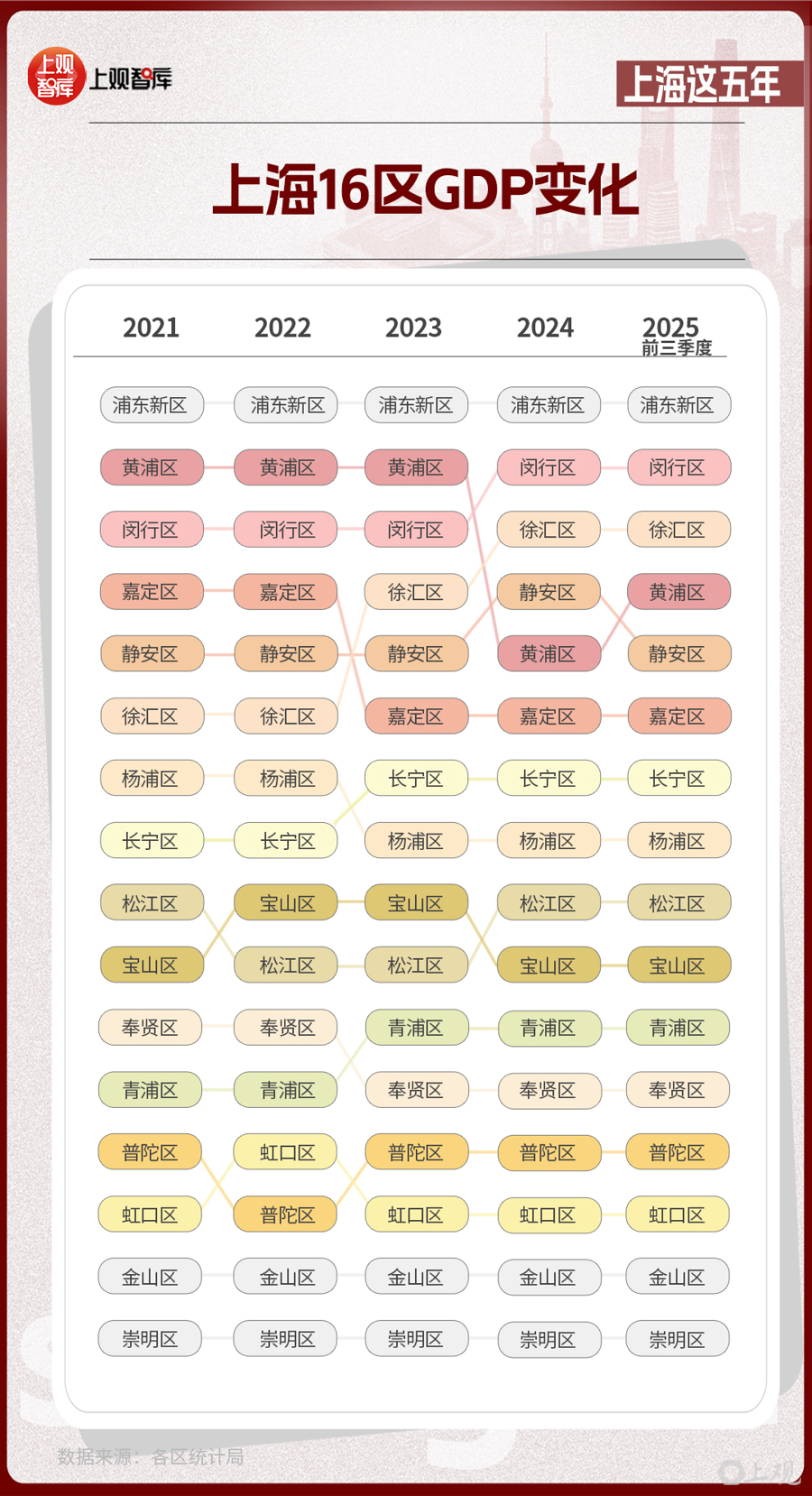 區(qū)域?qū)用妫虾?6區(qū)GDP的變化,體現(xiàn)出從中心向多極擴(kuò)散的趨勢。2021年,浦東新區(qū)GDP占全市近36%,而到了2025年,這一比重下降至約33%。其他區(qū)在這五年間,充分發(fā)揮自身優(yōu)勢,齊頭并進(jìn),為上海發(fā)展創(chuàng)造了更多增長極。