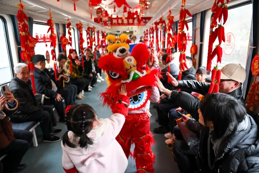 2024年2月23日,5630次列車上,旅客與舞獅互動。當(dāng)日,在元宵節(jié)到來之際,形式多樣的鬧元宵活動在貴州遵義開往重慶西的5630次公益性“慢火車”上舉行,吸引不少旅客參與其中,感受濃濃節(jié)日氣氛。 中新社記者 何蓬磊 攝