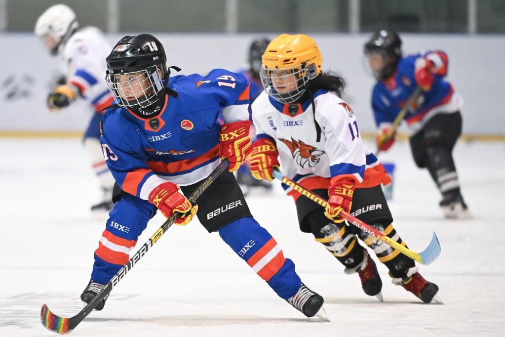 1月25日,在齊齊哈爾市的黑龍體育館內(nèi),二馬路小學翼虎冰球隊隊員劉金梓晨(左)在訓練中。新華社記者 張濤 攝