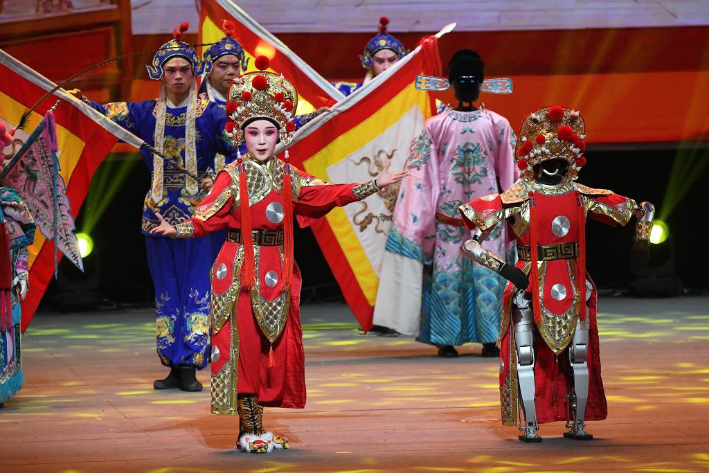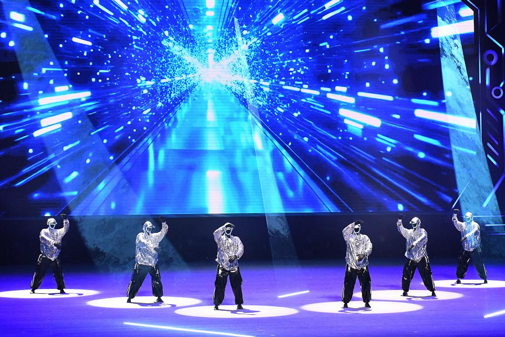 在開場節(jié)目《萬馬奔騰》中,20臺機械臂與26臺雙臂機器人齊揮鼓槌,激昂鼓聲奏出奮進(jìn)節(jié)拍。