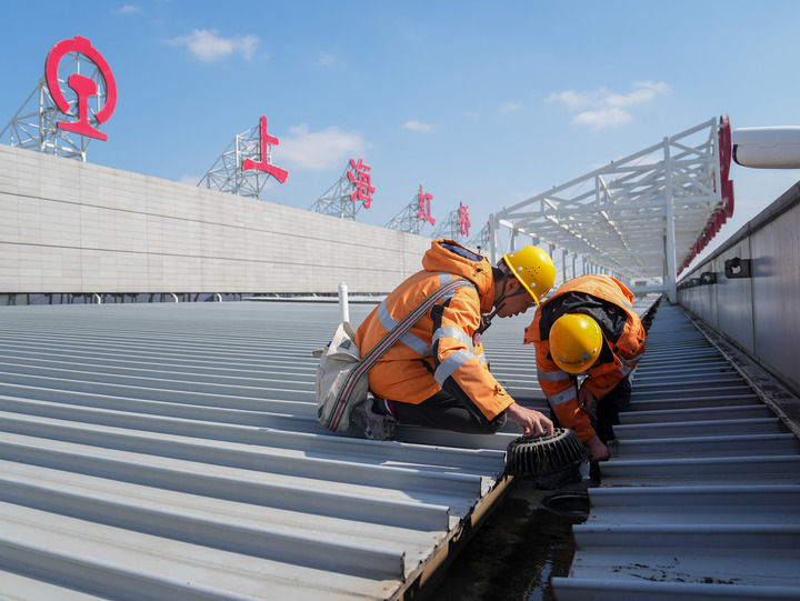 2月17日,中國鐵路上海局集團有限公司上海房建公寓段的工作人員在上海虹橋火車站的屋面鋼結構上清理垃圾。新華社記者 丁汀 攝