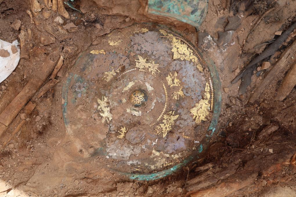 這是吐魯番市巴達(dá)木東晉唐時(shí)期墓群出土的金銀平脫花鳥紋銅鏡(資料照片)。新華社 發(fā)