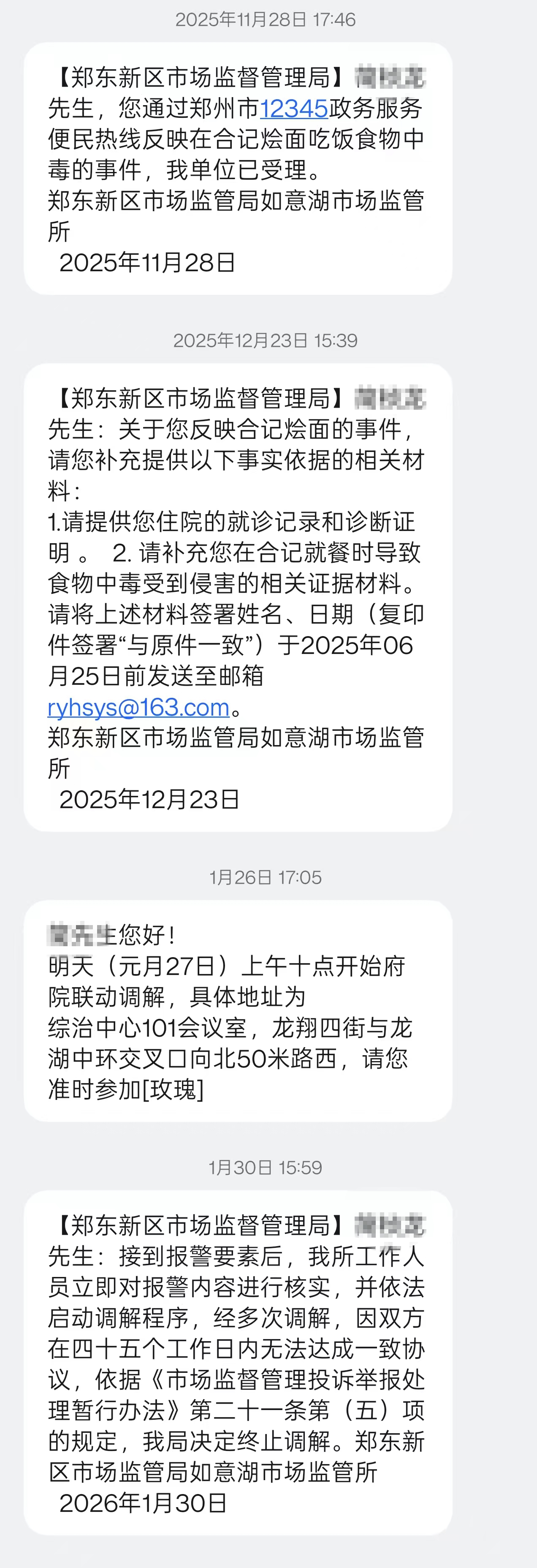 此后,鄭東新區(qū)市場監(jiān)督管理局向簡先生表示:經(jīng)多次調(diào)解,因雙方在四十五個(gè)工作日內(nèi)無法達(dá)成一致協(xié)議,依據(jù)《市場監(jiān)督管理投訴舉報(bào)處理暫行辦法》第二十一條第(五)項(xiàng)的規(guī)定,我局決定終止調(diào)解。