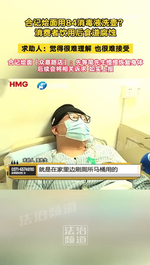中新網(wǎng)北京3月16日電(記者 劉星晨)“現(xiàn)在胃和食道還覺得疼,吃東西以流食和半流食為主,吞咽饅頭這種會(huì)有困難?!痹诤喯壬闹v述里,由于在鄭州合記燴面眾意路店用餐期間喝到了含有84消毒液的水,他過去三個(gè)月一度瘦了30斤。