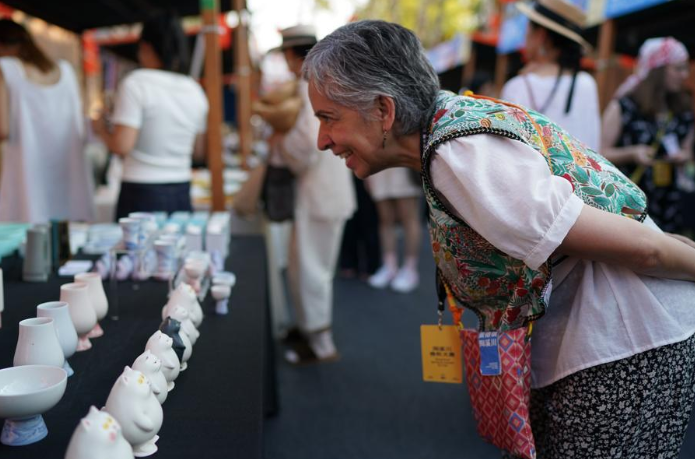 2025年10月17日,在江西景德鎮(zhèn)舉行的2025中國(guó)景德鎮(zhèn)國(guó)際陶瓷博覽會(huì)同期舉辦的陶瓷嘉年華上,一位外國(guó)藝術(shù)家正在欣賞陶瓷作品。圖源:新華社