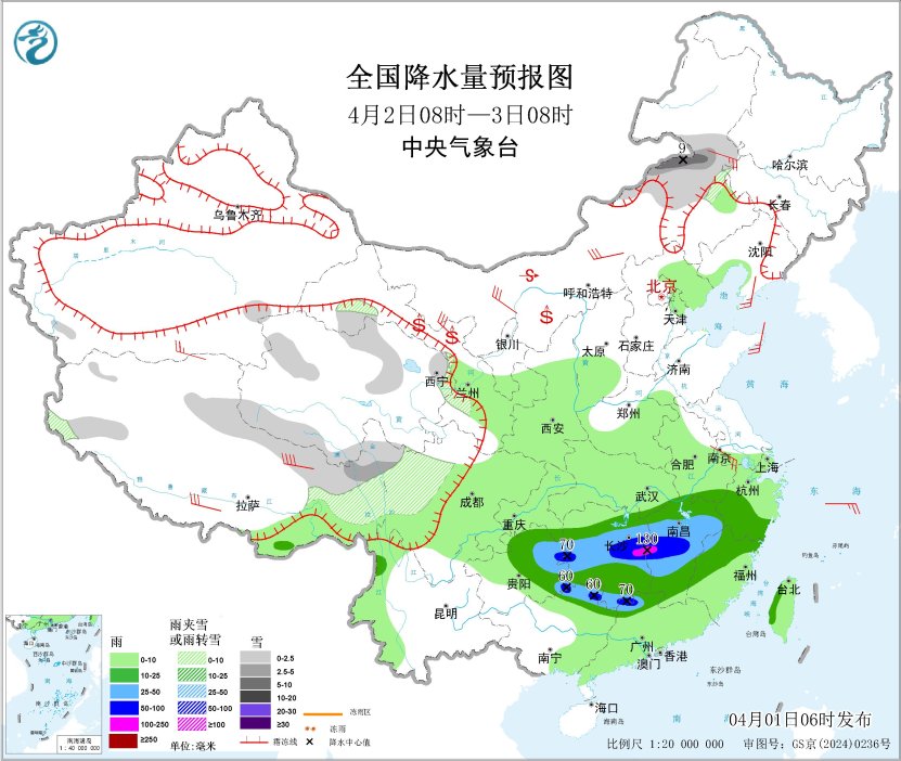 4月2日08時至3日08時,內(nèi)蒙古東部、西藏東部、青海南部、甘肅河西、川西高原北部等地部分地區(qū)有小到中雪或雨夾雪,其中,內(nèi)蒙古東部等地部分地區(qū)有大雪(5~9毫米)。江南大部、華南北部、貴州中東部等地部分地區(qū)有中到大雨,其中,貴州東部、湖南中部、江西中部、廣東北部、廣西東北部等地部分地區(qū)有暴雨或大暴雨(100~130毫米)。內(nèi)蒙古大部、遼東半島、山東半島、江蘇南部、西藏、甘肅河西等地部分地區(qū)有4~6級風(fēng),西藏東部部分地區(qū)有6~7級風(fēng);渤海、東海南部海域、臺灣海峽、巴士海峽、北部灣將有5~6級風(fēng)、陣風(fēng)7級。