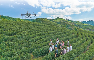 重慶市南川區(qū)在興隆鎮(zhèn)金花村白茶基地開(kāi)展高素質(zhì)農(nóng)民植保無(wú)人機(jī)飛手培訓(xùn)。羅 川攝(人民視覺(jué))