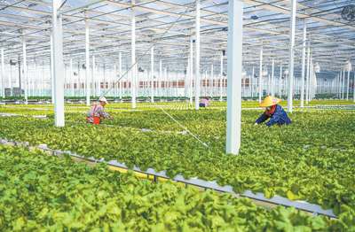 江蘇宿遷經(jīng)濟(jì)技術(shù)開(kāi)發(fā)區(qū)南蔡數(shù)字農(nóng)業(yè)產(chǎn)業(yè)園溫室大棚里,村民在對(duì)蔬菜秧苗進(jìn)行管護(hù)作業(yè)。