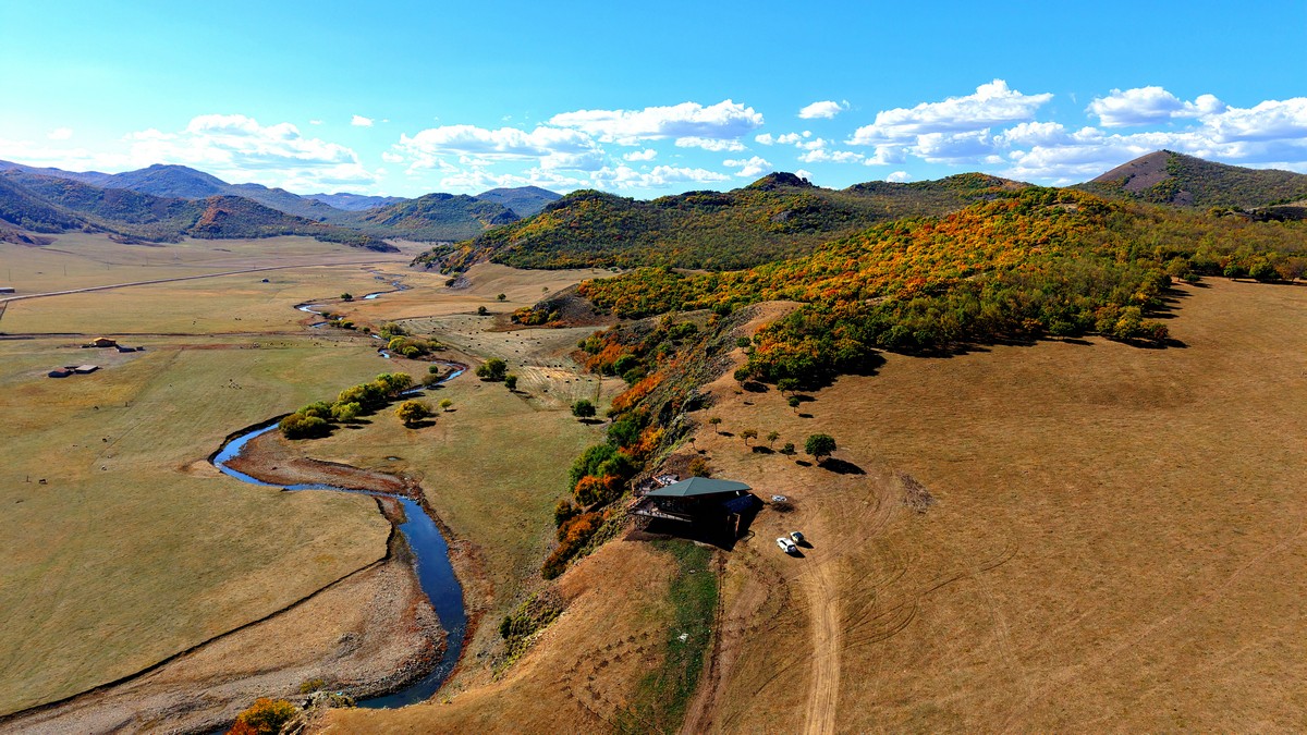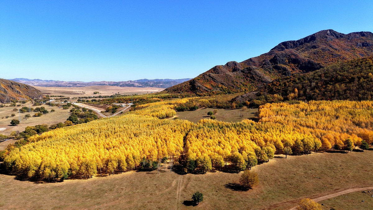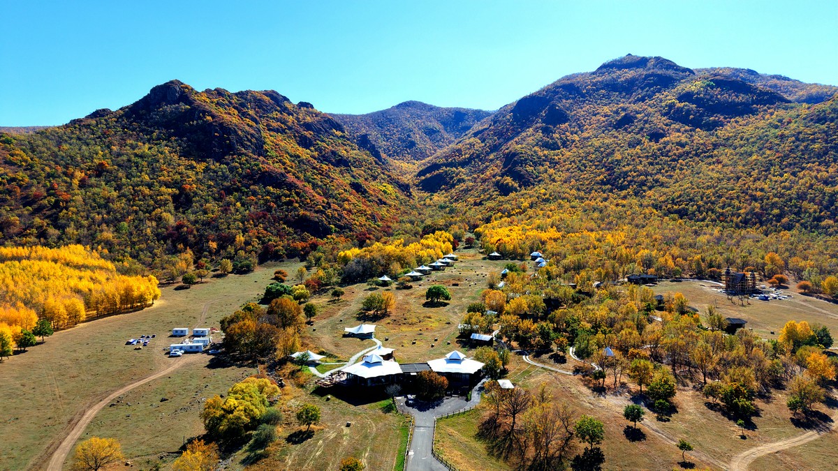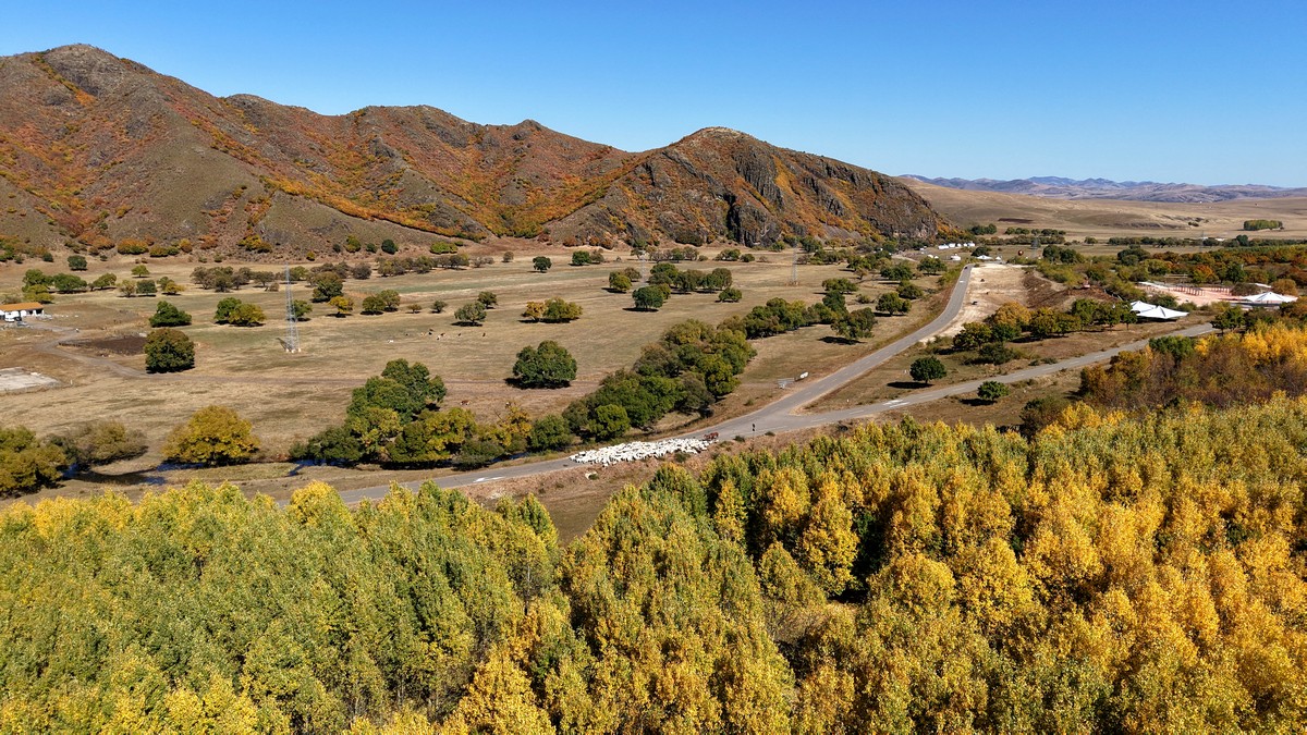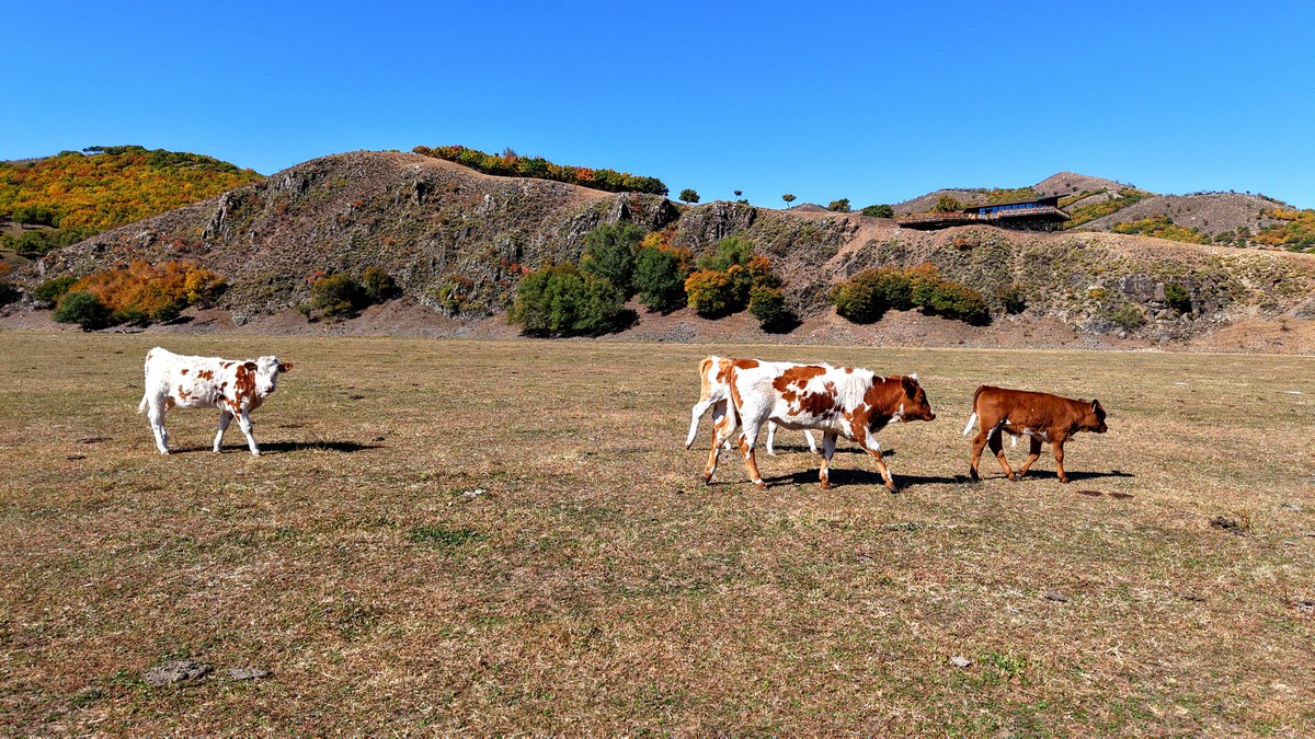 黑羊山旅游度假區(qū),海拔1319米,因這里的山形似黑羊頭得名。金秋時節(jié),整個景區(qū)被一片五彩斑斕的世界所籠罩,藍(lán)天、白云、溪流、牛羊群構(gòu)成一幅醉人的畫卷,恍若進(jìn)入童話世界。