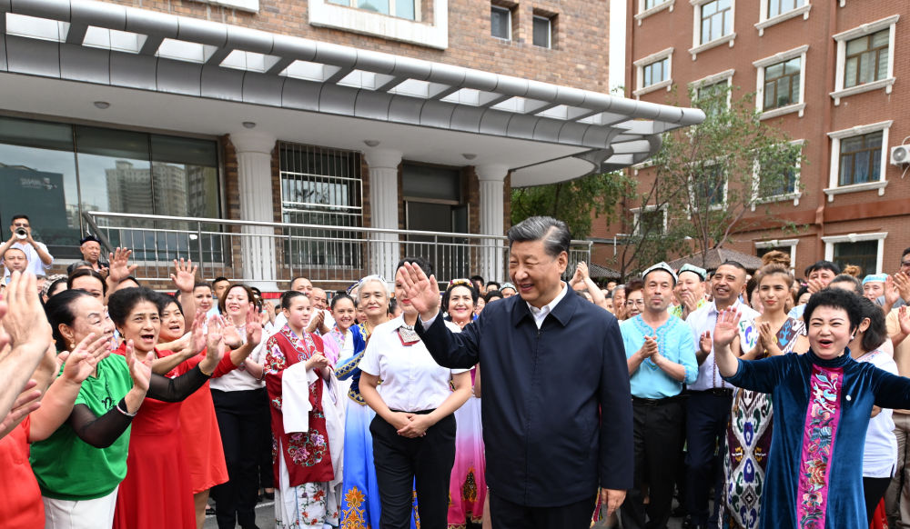 2022年7月13日上午,習近平在新疆烏魯木齊市天山區(qū)固原巷社區(qū)考察時,身著民族服裝的各族群眾簇擁在總書記身邊,載歌載舞,向總書記表達由衷的愛戴。