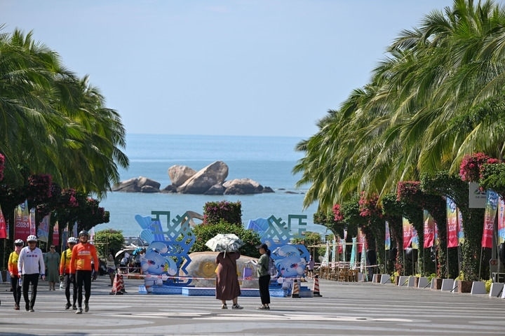 2024年11月19日,游客從位于三亞天涯海角游覽區(qū)的運(yùn)動會吉祥物前經(jīng)過。新華社記者 陳澤國 攝
