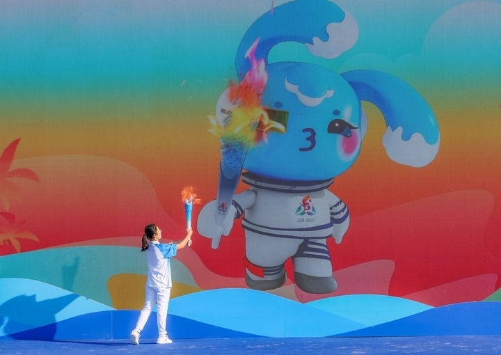 2024年11月17日,火炬手韓曉燕在三亞進(jìn)行的火炬實(shí)地傳遞活動起跑儀式上與本屆運(yùn)動會吉祥物“吉貝”對接,點(diǎn)燃火炬。新華社記者 陳朔 攝