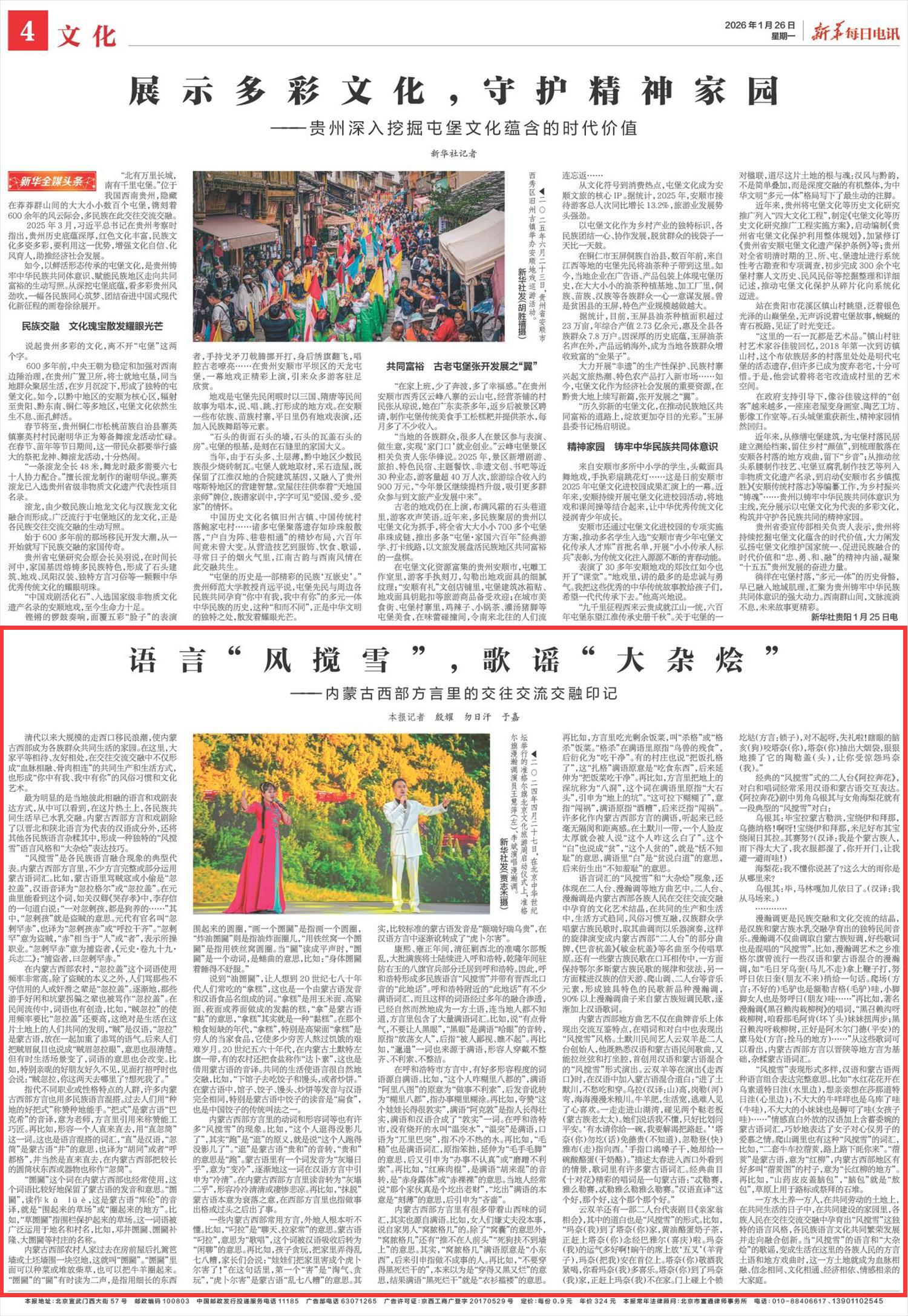 2026年1月26日《新華每日電訊》第4版刊發(fā)了《語(yǔ)言“風(fēng)攪雪”,歌謠“大雜燴”——內(nèi)蒙古西部方言里的交往交流交融印記》的文章,報(bào)道了內(nèi)蒙古西部方言和戲劇除了以晉北和陜北語(yǔ)言為代表的漢語(yǔ)成分外,還將其他各民族語(yǔ)言雜糅其中,形成一種獨(dú)特的“風(fēng)攪雪”語(yǔ)言風(fēng)格和“大雜燴”表達(dá)技巧。