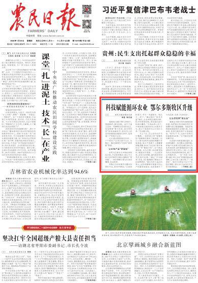 2026年1月29日,《農(nóng)民日報》頭版刊發(fā)題為《科技賦能循環(huán)農(nóng)業(yè) 鄂爾多斯牧區(qū)升級》的文章,報道了在內(nèi)蒙古鄂爾多斯市祖祖輩輩“靠天吃飯、逐水草而居”的傳統(tǒng)被改寫,取而代之的是科技賦能的精細化種養(yǎng),是貫通三產(chǎn)的新興業(yè)態(tài)。越來越多的農(nóng)牧民,正沿著“新一產(chǎn)”鋪就的這條路,走向收入更穩(wěn)、底氣更足的好日子?! ?/p>