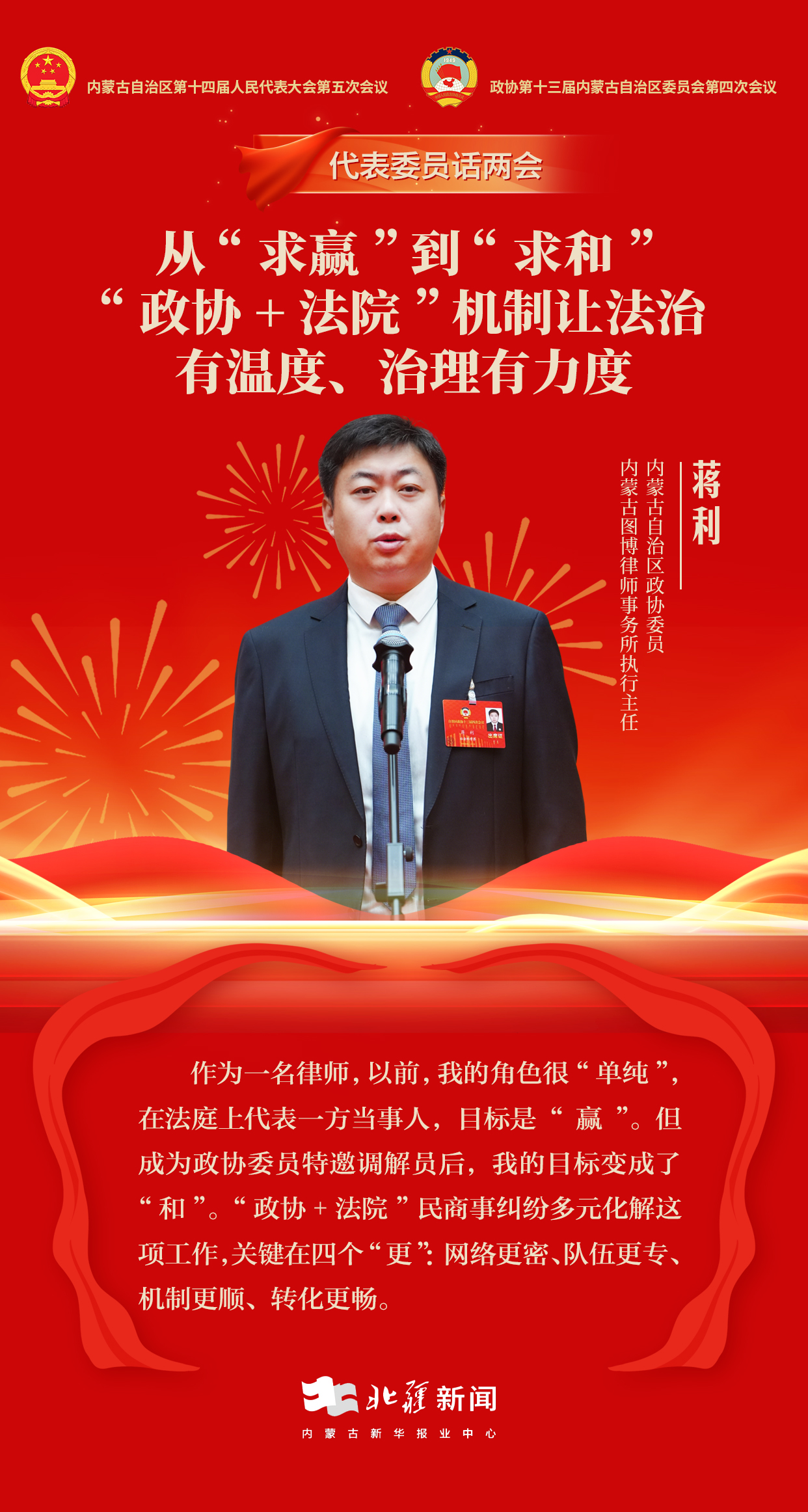 北疆新聞呼和浩特2月3日消息(記者 張鑫 楊凈毓 李文華)“作為一名律師,以前,我的角色很‘單純’,在法庭上代表一方當(dāng)事人,目標(biāo)是‘贏’。但成為政協(xié)委員特邀調(diào)解員后,我的目標(biāo)變成了‘和’?!弊灾螀^(qū)政協(xié)委員、內(nèi)蒙古圖博律師事務(wù)所執(zhí)行主任蔣利說。
