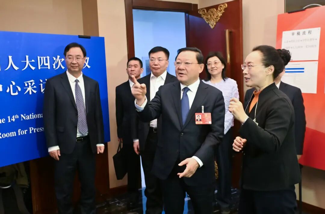 3月6日,自治區(qū)黨委書記、人大常委會(huì)主任王偉中,自治區(qū)黨委副書記、自治區(qū)人民政府主席包鋼在內(nèi)蒙古日?qǐng)?bào)社兩會(huì)報(bào)道工作間與記者代表親切交流,詳細(xì)了解宣傳報(bào)道情況。草原云·內(nèi)蒙古新聞網(wǎng)記者 馬建兵 攝