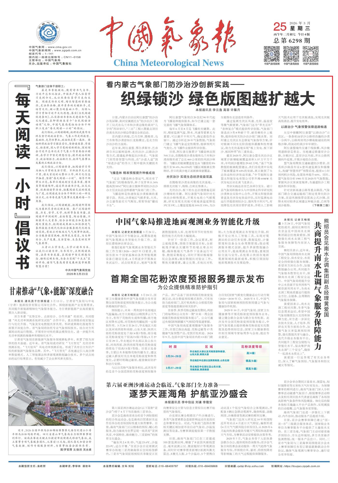 2026年3月25日《中國氣象報(bào)》第1版刊發(fā)了《看內(nèi)蒙古氣象部門防沙治沙創(chuàng)新實(shí)踐—織綠鎖沙綠色版圖越擴(kuò)越大》的文章,報(bào)道了內(nèi)蒙古阿拉善盟啟動(dòng)沿黃光伏治沙等“三北”六期防沙治沙重點(diǎn)工程,氣象部門精準(zhǔn)賦能飛播造林、光伏治沙、以路治沙三大模式,提供全流程技術(shù)支撐,大幅提升治沙成效與生態(tài)經(jīng)濟(jì)效益,筑牢北方生態(tài)安全屏障。
