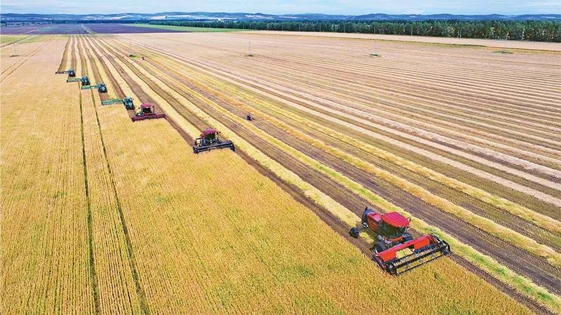 實(shí)施鄉(xiāng)村振興戰(zhàn)略,必須把確保重要農(nóng)產(chǎn)品特別是糧食供給作為首要任務(wù),把提高農(nóng)業(yè)綜合生產(chǎn)能力放在更加突出的位置,把“藏糧于地、藏糧于技”真正落實(shí)到位。圖為2022年8月17日,大型秋收機(jī)械在內(nèi)蒙古呼倫貝爾農(nóng)墾牙克石農(nóng)牧場(chǎng)有限公司第四連(隊(duì))集群割曬作業(yè)。人民圖片王國印/攝